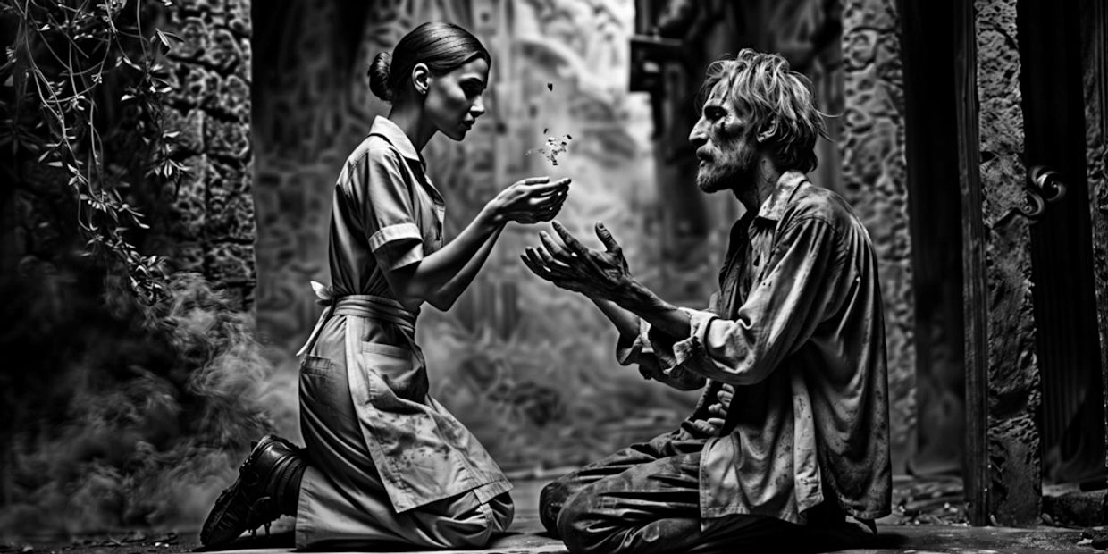 As he turns, the full sight is revealed. A motionless body slumped against the side of the vehicle. Legs spreadeagled, arms hanging limply at the side, hands resting open on blood splattered concrete. Clothes ripped and punctured, with blood draining from terrible wounds underneath. Eyes narrowing then widening, peering from a horribly swollen, blood-stained face, pleading as Nestor approaches.